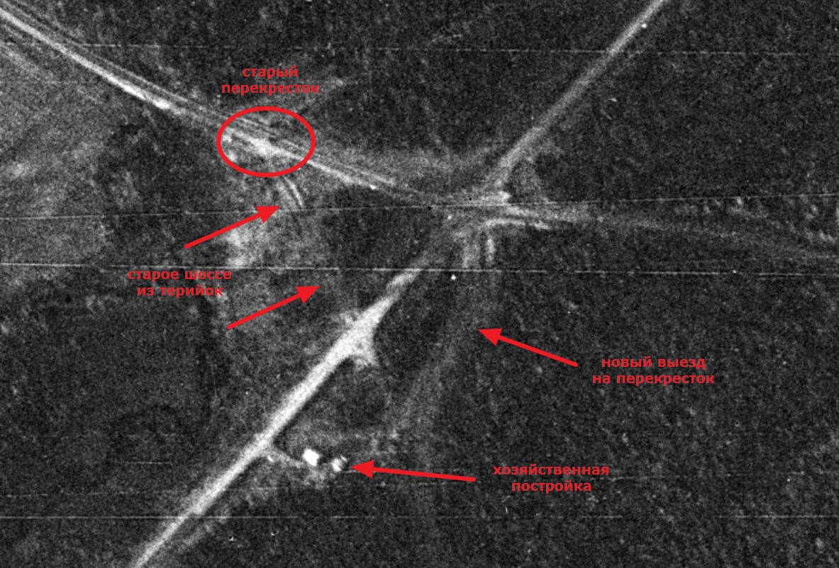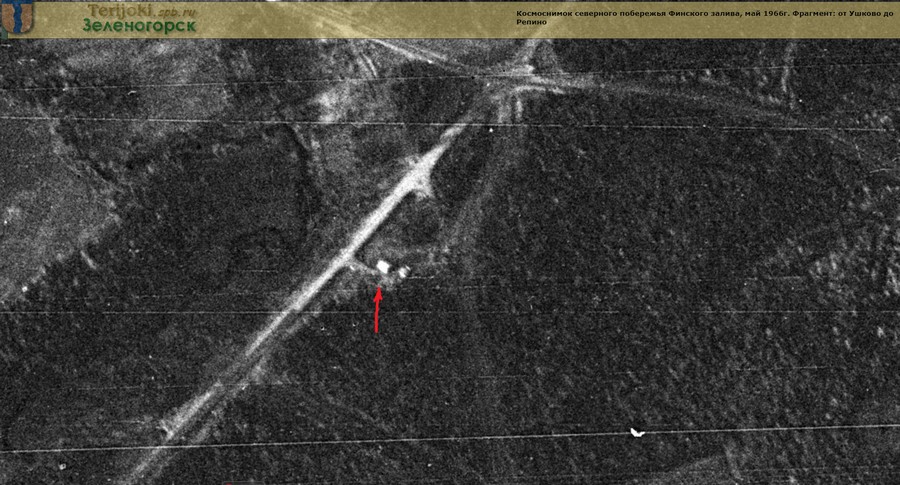 В правой части снимка виден песчаный спуск к озеру. Напротив него от основной асфальтированной дороги, идущей через посёлок, и было сделано короткое асфальтированное ответвление к магазину."