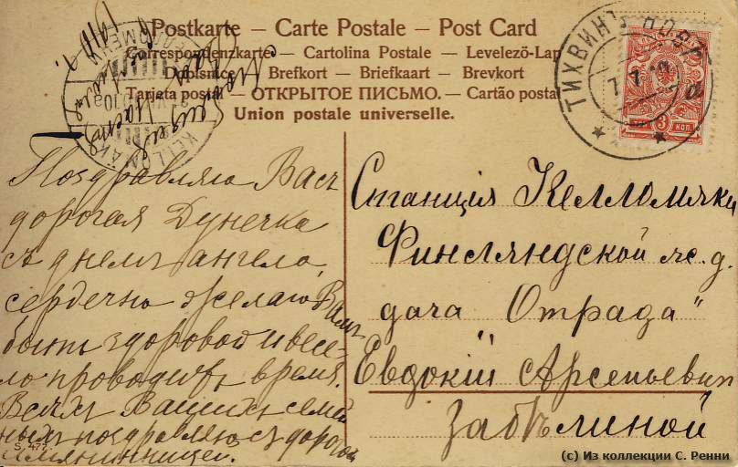 Справка: Открытка адресована Евдокии Арсеньевне, дочери владельца дачи "Отрада" и купца 2-й гильдии Арсения Андреевича Забелина (участок №56). Впоследствии она приняла постриг в Иоанновском женском монастыре на Карповке под именем Серафимы.