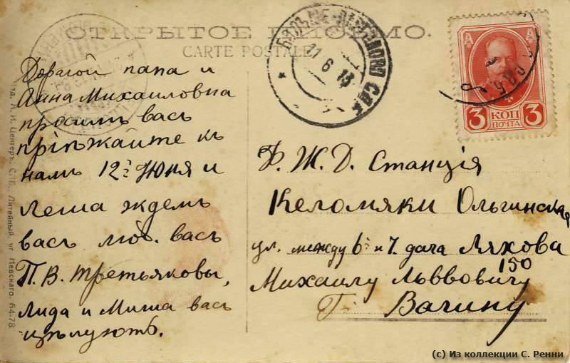 Адрес: Ф.Ж.Д. Ст. Келломяки. Ольгинская ул. между 6-й и 7-й. Дача Ляхова 150. Михаилу Львовичу г-ну Вагину.