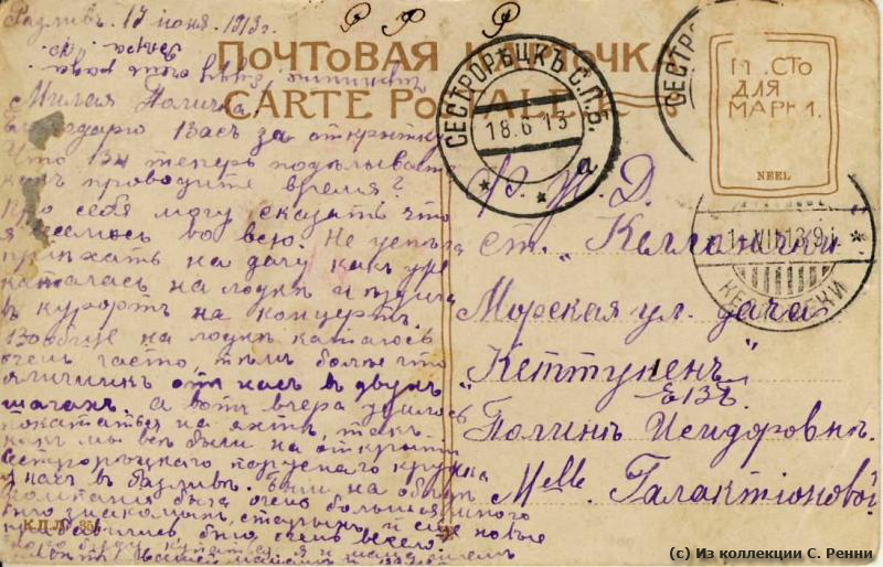 21. Открытка, отправленная в июне 1913 года со ст.Разлив в Келломяки на дачу Кеттунен для П. И. Галактионовой.