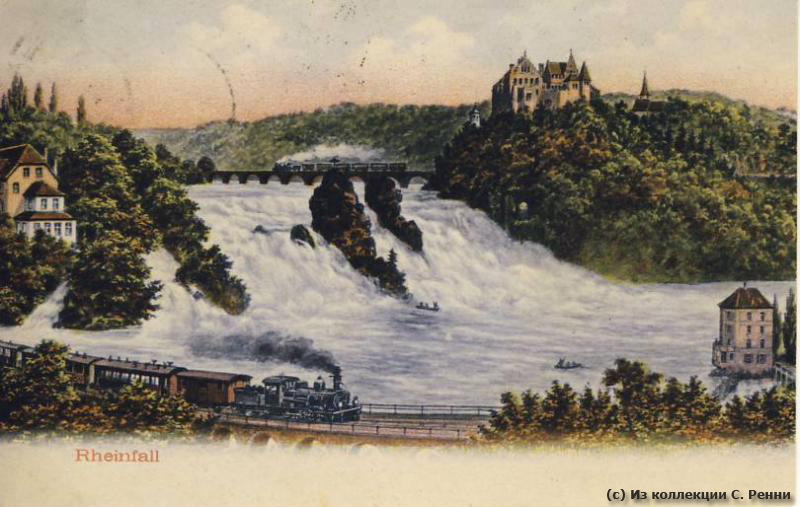 Изображение: На лицевой стороне открытки раскрашенная фотография Рейнского водопада.