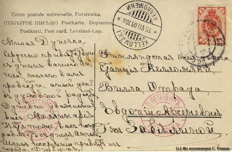 Штемпель получателя (п/о Келломяки): 19.07.1908 (дата по новому стилю).