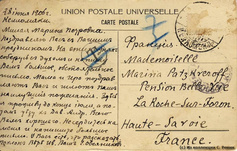 Адрес: Франция. Mademoiselle Marina Patzkveroff, pension Belle-Vue, La Roche-Sur-Foron, Haute Savoie, France.