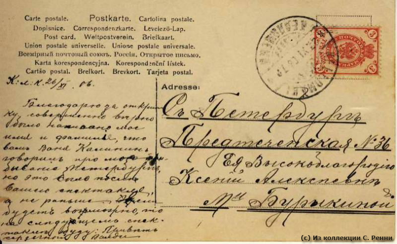 Адрес: С.-Петербург, Предтеченская №36, Ея Высокоблагородию Ксении Алексеевне m-lle Бурыкиной.