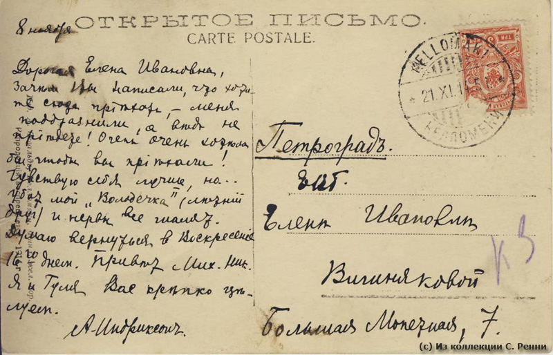 Штемпель отправителя (Келломяки): 21.11.1914 (по новому стилю)