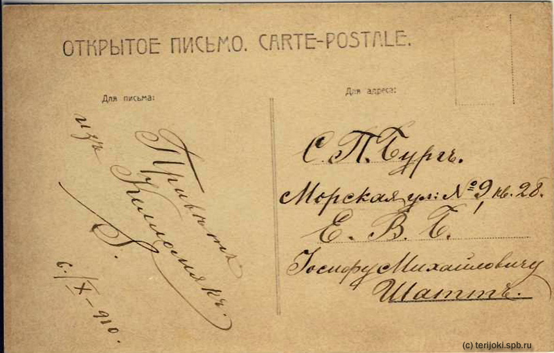 Адрес: СПб, Морская ул., д. №9, кв. 28. Е. В. Б. Иосифу Михайловичу Шатт.