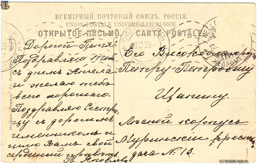Штемпель получателя (Петербург): 29.06.1909 (дата по старому стилю)