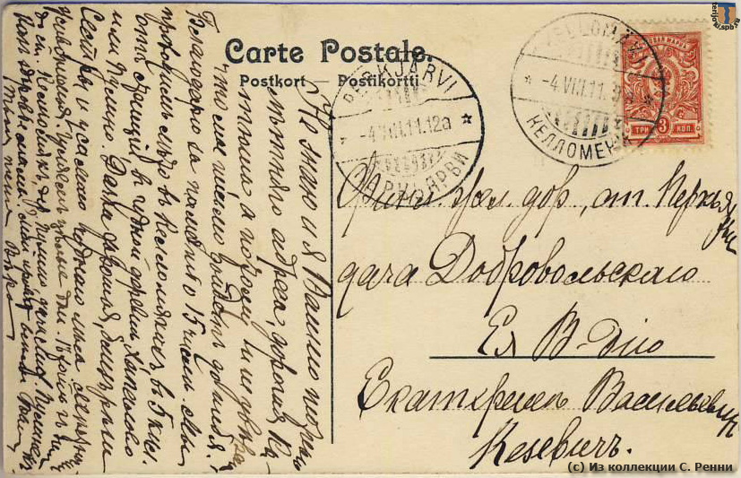 Адрес: Финляндская жел. дор., ст. Перкярви, дача Добровольского. ЕВР Екатерине Васильевне Кезевич.