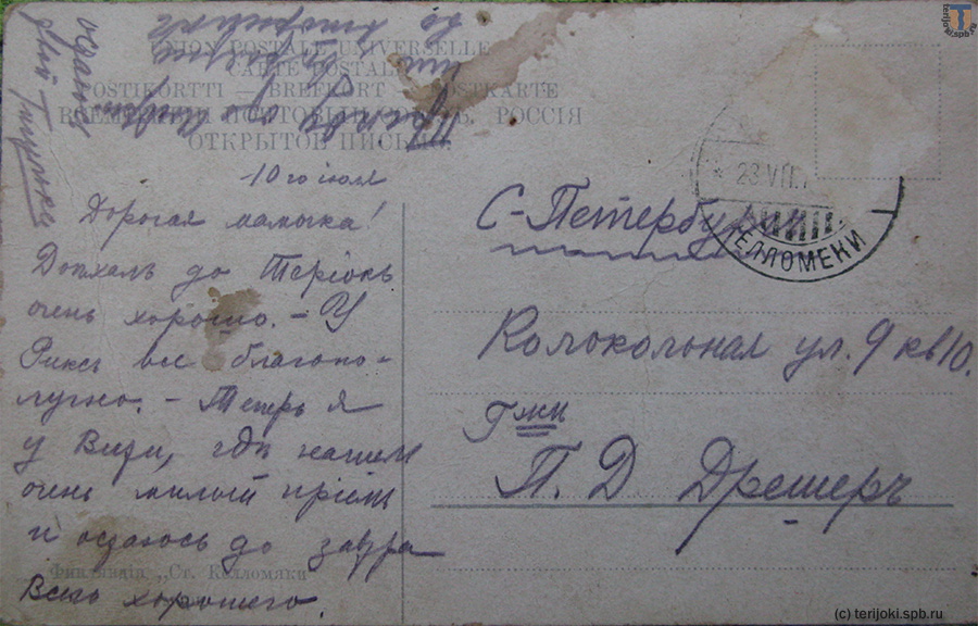 Штемпель отправителя (Келломяки): 23.07.191? (дата по новому стилю)