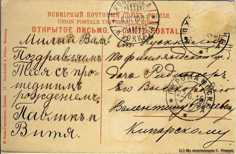 Справка: Открытка адресована Валентину Ренеевичу Кипарскому (1904-1983), будущему языковеду, профессору славянской филологии Университета в Хельсинки, академику, которому на момент написания открытки было 6 лет. Его поздравляют с прошедшим днем рождения друзья, адрес написан рукой взрослого. Открытка адресована на дачу Ридингера в Куоккала. После 1910 года Кипарские жили на своей собственной даче близ Перкъярви, в Сяркиярви.