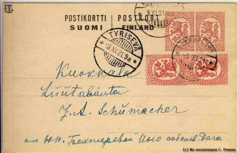 Обратите внимание на скорость доставки корреспонденции - штемпель отправления Ваммелсуу 8-00, транзитный штемпель Тюрисевя 9-00, штемпель прихода Куоккала 10-00.