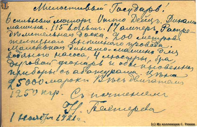 Милостивый государь! 6-сильный мотор Отто Дейц. Динамо-машина 115 вольт 17 ампер. Распределительная доска. 200 метров железного (нрзб) провода. Маленькая динамо-машина для водяного насоса. 4 люстры, бра, дуговой фонарь и обыкновенные приборы с абажурами. Цена 25.000 марок. Весь двигатель 1250 кгр.