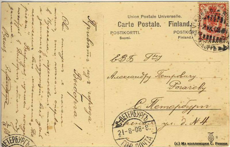 Штемпель получателя (Петербург): 21.08.1908 (дата по старому стилю).