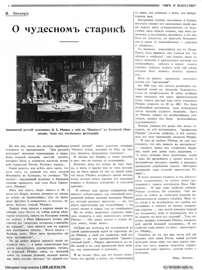 Статья В. Зеелера "О чудесном старике" в журнале "Мiръ и Искусство", №4, июнь 1930 г. с одной из последних фотографий И. Е. Репина