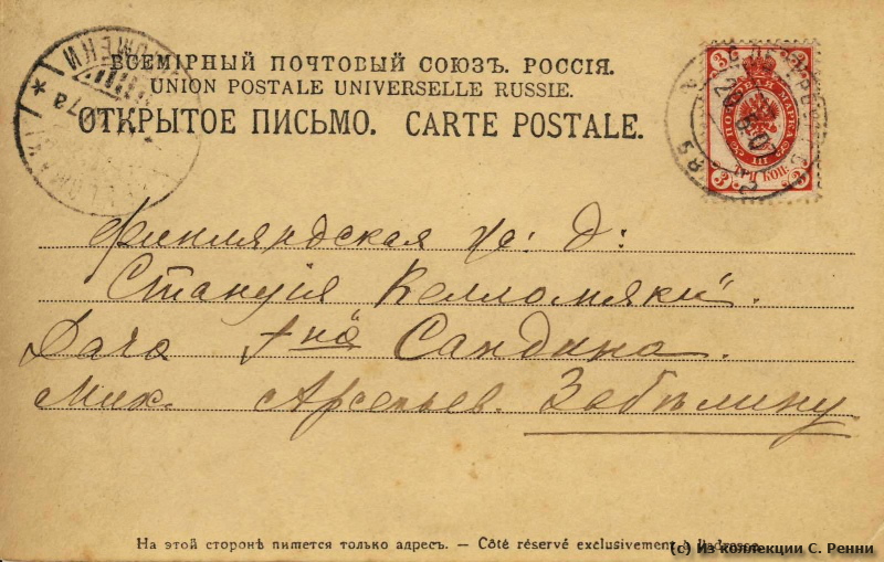 Адрес: Финляндская ж.д. Станция Келломяки. Дача г-на Сандина. Мих. Арсеньев. Забелину.