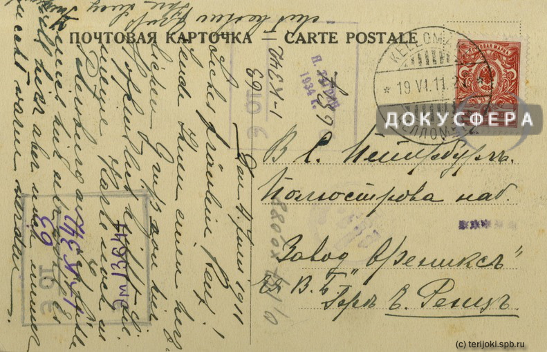 Штемпель отправителя (Келломяки): 19.06.1911 (дата по новому стилю).