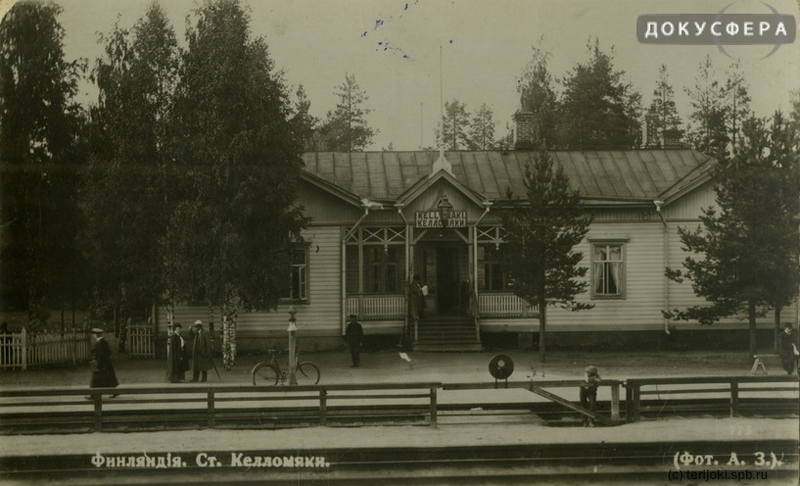 Изображение: На лицевой стороне открытки изображен железнодорожный вокзал станции Келломяки, фото А. Зевальда. Изображение открытки приводится по электронный фонду Российской Национальной Библиотеки.
