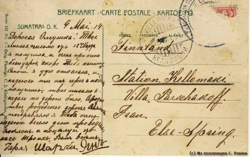 19. Открытка, отправленная в мае 1914 года с острова Суматра (!) в Келломяки на дачу Паршакова Эльзе Шпринг.