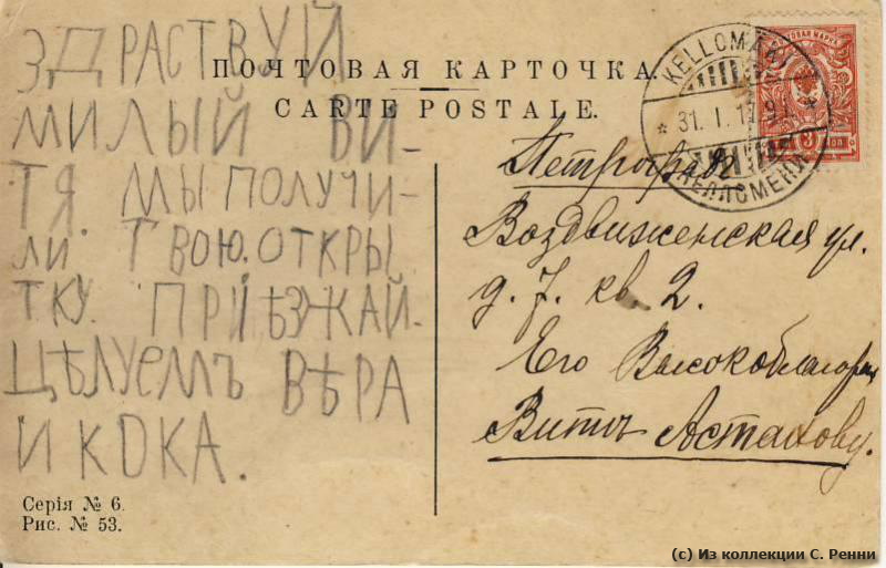 Штемпель отправителя (п/о Келломяки): 31.01.1917 (дата по новому стилю).