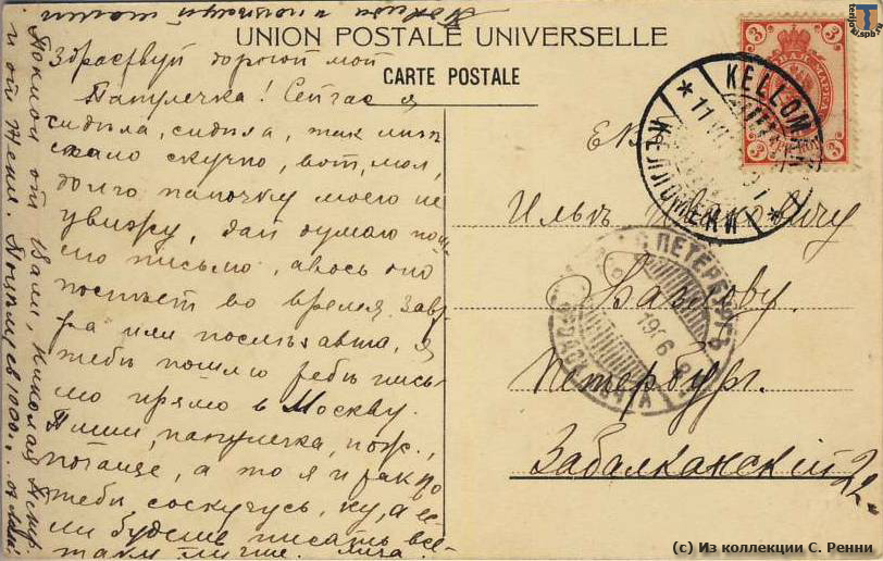 Справка: Еще одна открытка из переписки семьи Базловых, владевших несколькими участками в Келломяки. Другие открытки из нашего архива  – 1906 г., 1909 г., 1911 г., 1913 г.