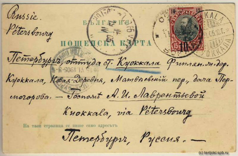 24. Открытка, отправленная в июне 1905 г. из Софии через С.-Петербург в Куоккала на дачу Пермогорова А. И. Лаврентьевой.