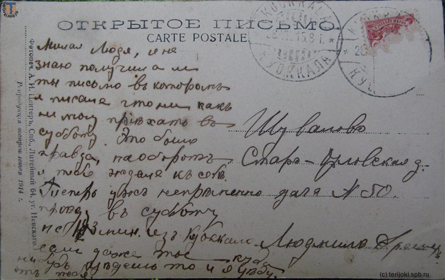 Штемпель отправителя (Куоккала): 28.08.1915 (дата по новому стилю).