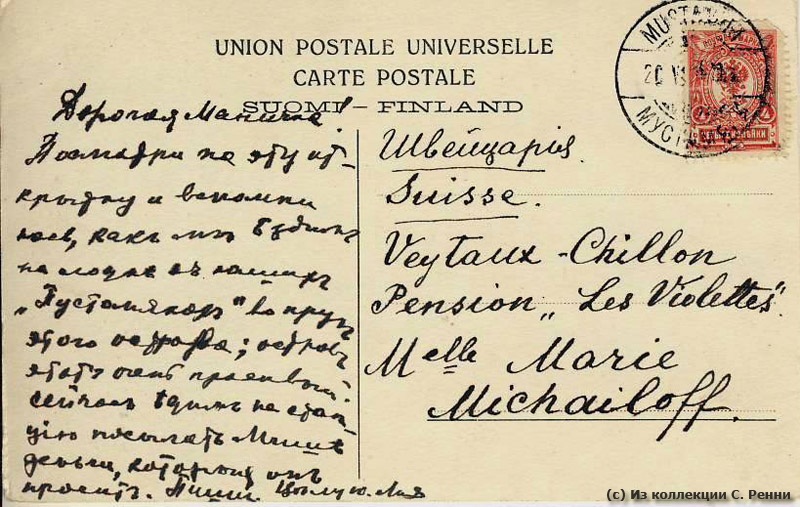 4. Открытка, отправленная в 1914 г. из Мустамяки в Швейцарию М. Михайловой.