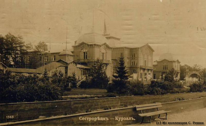 Изображение: На лицевой стороне открытки изображен Курзал Сестрорецкого Курорта. Почтовая карточка (фотопечать) изд. А.И. Центер (Петроград).