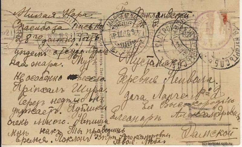 Штемпель получателя (Мустамяки): 18.07.1916 (дата по новому стилю).