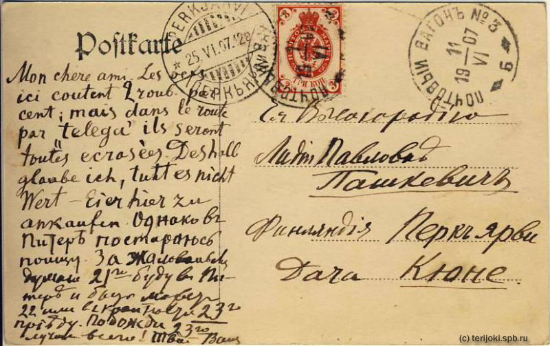 Штемпель получателя (Перкъярви): 26.06.1907 (дата по новому стилю).