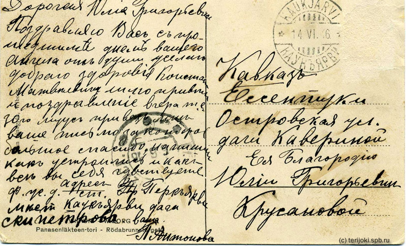 12. Открытка, отправленная в июне 1916 г. из Каукъярви (Каменка) через Перкъярви (Кирилловское) в Ессентуки Ю. Г. Крусановой.