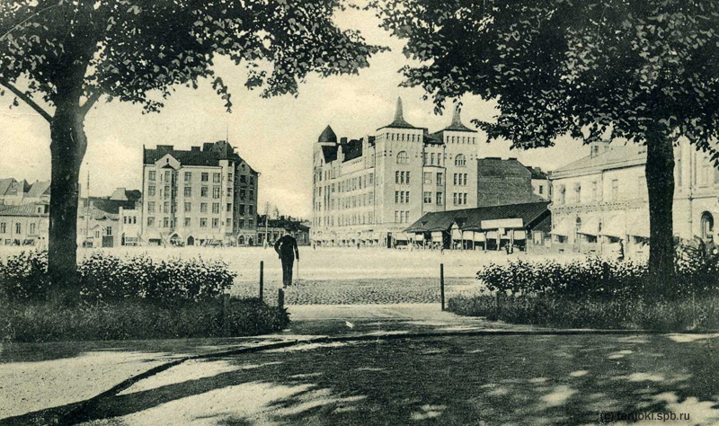 Изображение: На иллюстративной стороне открытки - площадь Красного колодца в Выборге, открытка изд. Линдгрена.
