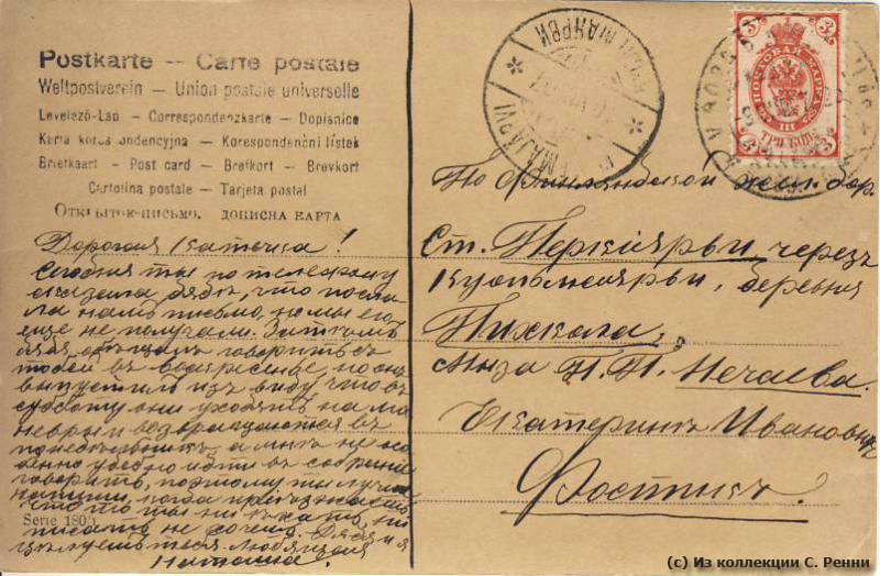 13. Открытка, отправленная в 1907 г. из Выборга в д.Пихкала (ныне Мамонтовка) через Куолемаярви и ст. Перкъярви на дачу П. П. Нечаева для Е. И. Фостинг.