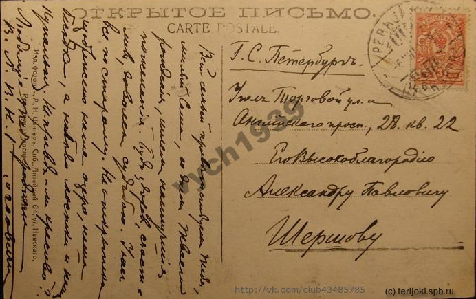 Адрес: С.-Петербург, угол Торговой улицы и Английского пр., 28, кв. 22. ЕВБ Александру Павловичу Шершову.