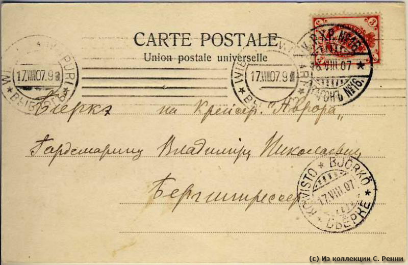 Штемпель транзитный (Выборг): 17.08.1907 (дата по новому стилю).