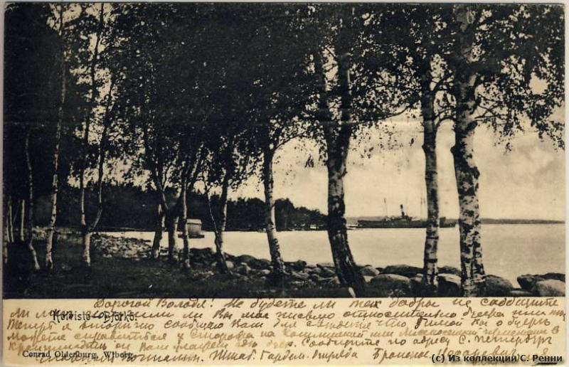Изображение: На иллюстративной, она же текстовая (старый формат) стороне открытки - известная открытка К. Ольденбурга с видом Койвисто, середина 1900-х гг.