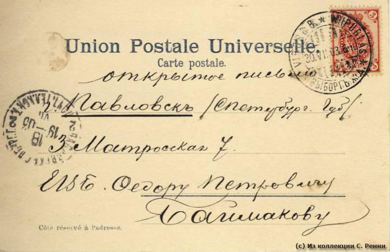 3. Открытка, отправленная в июле 1903 г. из Выборга в Павловск Ф. П. Баймакову