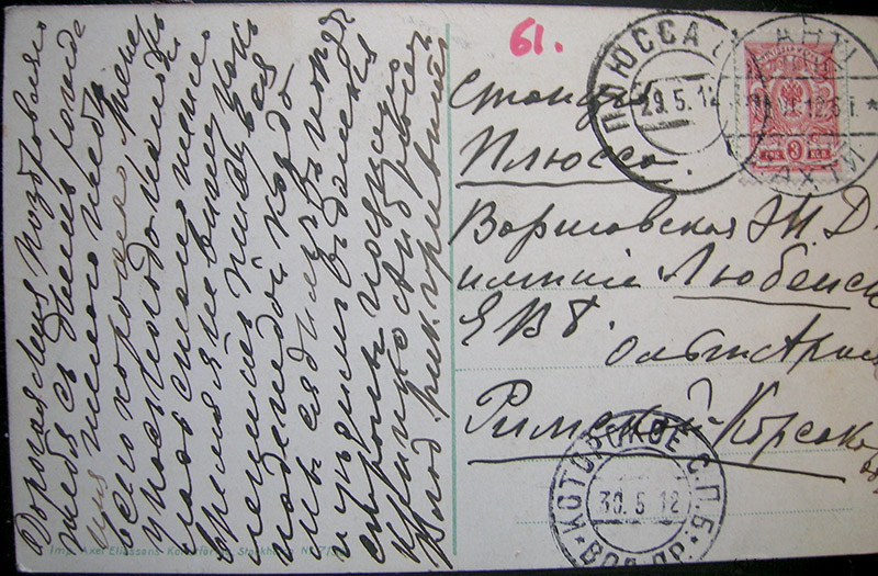 Адрес: станция Плюсса. Варшавская ж.д. Имение Любенск. Е.В.Б. Ольге Арт. Римской-Корсаковой.