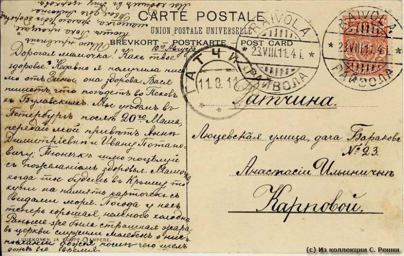 1. Открытка, отправленная в августе 1911 г. из Райволы в Гатчину А. И. Карповой.