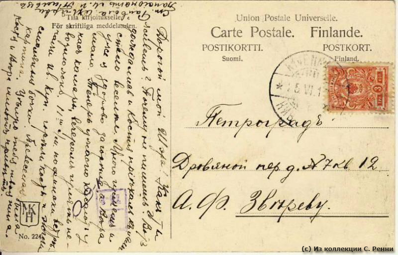 3. Открытка, отправленная в июне 1917 г. из Кивеннапа (п. Первомайское) в Петроград А. Ф. Звереву.