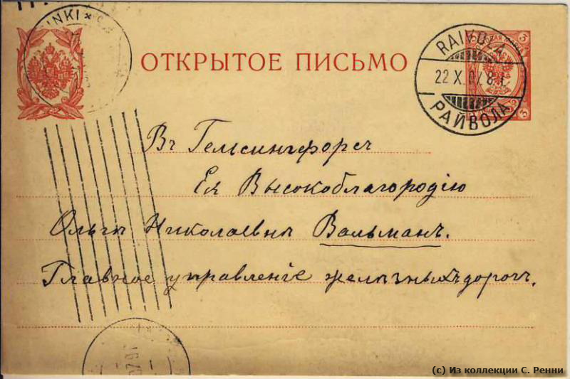 Адресат письма – почти наверняка дочь начальника ст. Райвола Николая Ивановича Вальмана. В нашем архиве есть еще два письма, адресованных О. Н. Вальман в Гельсингфорс - в 1908 г. и в 1909 г..