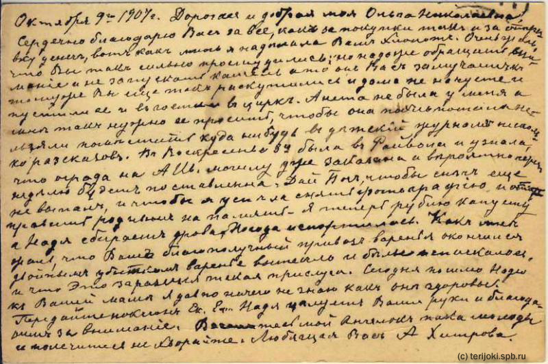 Дорогая и добрая моя Ольга Николаевна. Сердечно благодарю Вас за все, как за покупки, так и за отправку денег, вот как много я наделала Вам хлопот. Очень жаль, что Вы так сильно простудились, но надо же обращать внимание и не запускать кашель, а то он Вас замучает. К тому же Вы еще там раскутались(?) и дома не ночуете, и пустили ее и в гости, и в цирк. Анета не была у меня, а мне так нужно ее просить , чтобы она ... нельзя ли поместить куда-нибудь в детский журнал несколько рассказов. В воскресенье, 8-го, была в Райволе и узнала, что ограда на А. Ив. могилу уже заказана и, вероятно, через неделю будет поставлена. Дай Бог, чтобы снег еще не выпал, и я успела снять фотографию и отправить родным на память. Я теперь рублю капусту, а Надя сбирает дрова. Погода испортилась. Как мне жаль, что Ваш благополучный привоз варенья окончился двойным убийством: варенье вытекло, и белье испачкалось. И что это за разиня такая прислуга. Сегодня пошлю Надю к Вашей маме. Я давно ничего не знаю, как они здоровы. Передайте поклон Ек. ...(?) Надя целует Ваши руки и благодарит за внимание. ...,мой ангелок, пока молоды, и полечитесь, не хворайте. Любящая Вас А.Хитрова