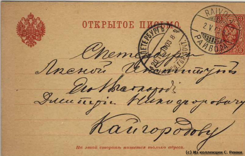 7. Открытка, отправленная в апреле 1903 г. из Райволы в С.-Петербург Д. Н. Кайгородову.