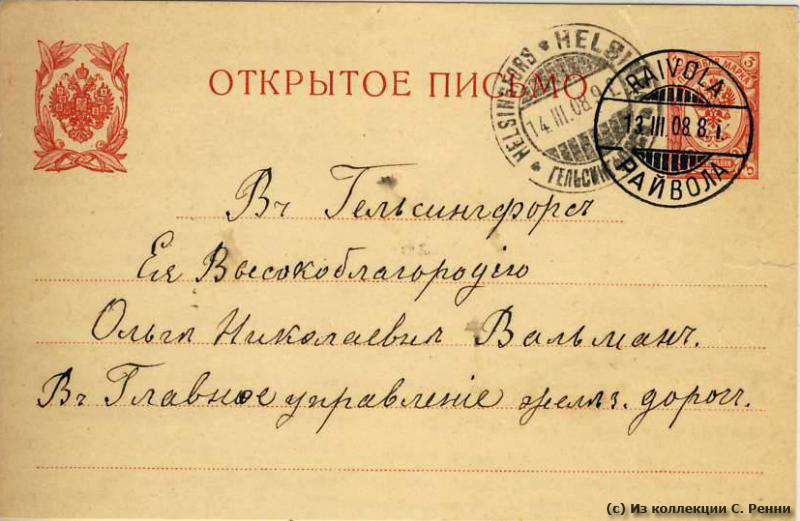 Штемпель отправителя (Райвола): 13.03.1908 (по новому стилю).
