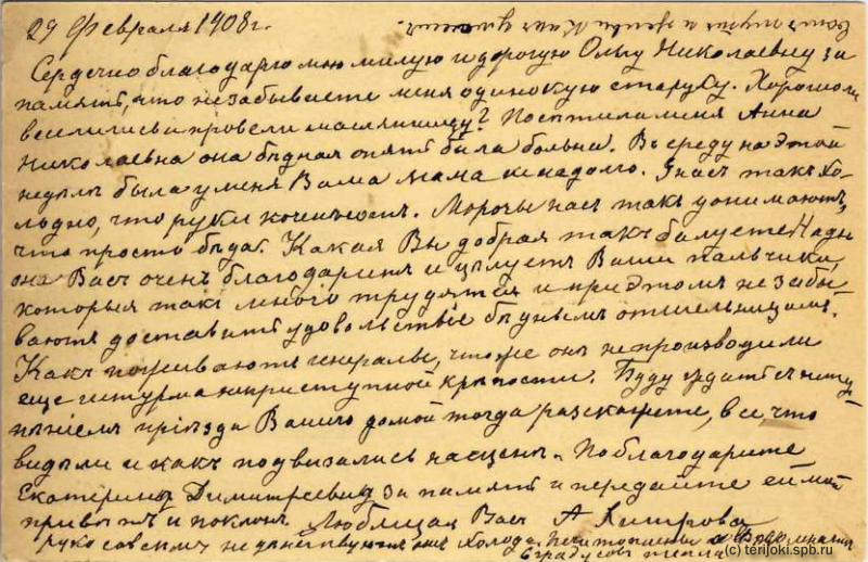 Сердечно благодарю мою милую и дорогую Ольгу Николаевну за память, что не забываете меня, одинокую старуху. Хорошо ли веселились и провели Масленицу? Посетила меня Анна Николаевна. Она, бедная, опять была больна. В среду на этой неделе была у меня Ваша мама ненадолго. У нас так холодно, что руки коченеют. Морозы нас так донимают, что просто беда. Какая Вы добрая, так балуете Надю. Она Вас очень благодарит и целует Ваши пальчики, которые так много трудятся и при этом не забывают доставить удовольствие бедным отшельницам. Как поживают генералы. Что же они не производили еще штурма неприступной крепости? Буду ждать с нетерпением приезда Вашего домой, тогда расскажете, все что видели и как подвизались на сцене. Поблагодарите Екатерину Дмитриевну за память и передайте ей мой привет и поклон. Любящая Вас А.Хитрова.