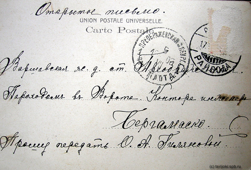 Адрес: Варшавская ж.д., ст. Преображенская, пароходом в Ворота. Контора инженера Бергамаско. Прошу передать О. А. Гиляновой (см. адресную сторону открытки).