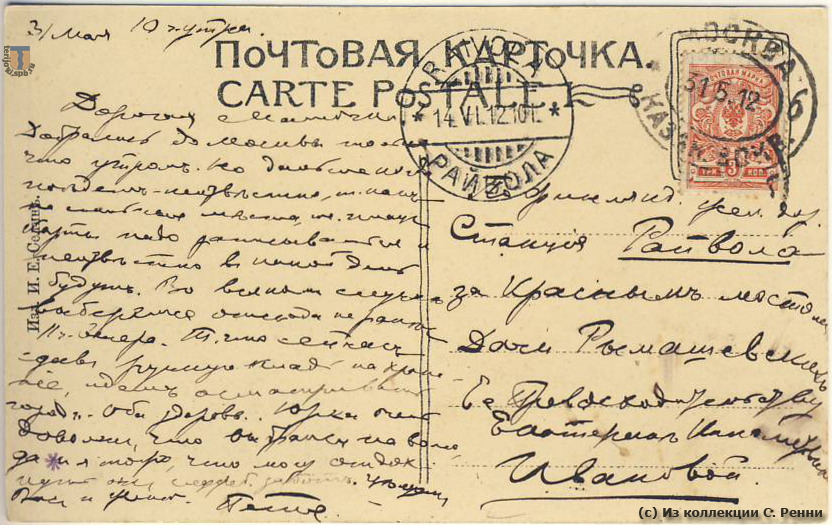 Штемпель получателя (Райвола): 14.06.1912 (по новому стилю).