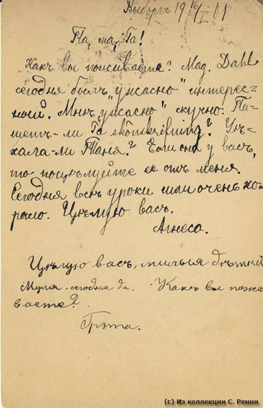 Текст: Па, Ма, Га! Как вы поживаете? Мад(емуазель) Даль сегодня был "ужасно" интересный. Мне "ужасно" скучно. Пишет ли Га (неразб.)? Уехала ли Таня? Если она у вас, поцелуйте ее от меня. Сегодня все уроки шли очень хорошо. Целую вас. Агнеса