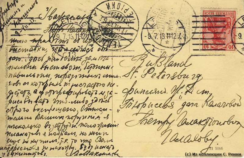 Штемпель отправителя (Лейпциг): 09.07.1913 (дата по новому стилю).