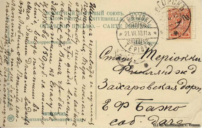 Адрес: Ст. Терийоки, Финляндская ж.д. Захаровская дорога, Е. Ф. Бажо соб[ственная] дача.